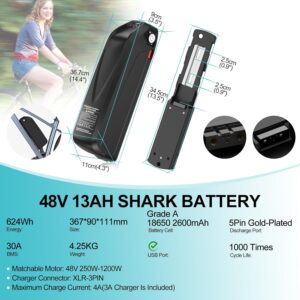 Parameter : This 48V 13Ah e-bike battery is compatible with mid motors and hub motors ranging from 50W to 1100W , including 1000W , 750W and 500W models. It features a maximum continuous discharge current of 30A . The dimensions are 367mm x 90mm x 111mm , with an XT60 Female discharge connector and 5 golden pin battery base