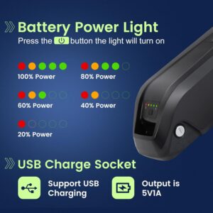 The 36V battery is equipped with a range of innovative features including an anti-theft Safe Lock, LED power indicator for real-time battery status, a power switch to minimize energy loss, and a USB port for charging devices. Enjoy added safety with the waterproof case and anti-vibration pads