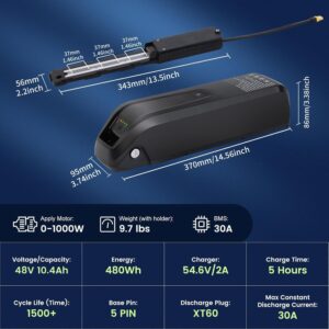 The 36V Ebike Battery measures 14.47*3.7*4.64 inches. Before purchasing, ensure that this size fits your battery space to avoid unnecessary returns. Our electric bike battery comes with a 5-pin base and a female XT60 discharge cable for easy integration
