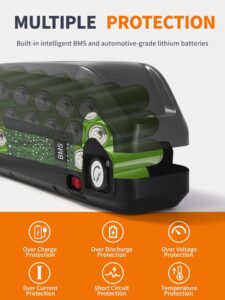 Long-lasting Performance: Made from waterproof ABS material and high-quality Class A cells, this ebike battery ensures extended riding times and outperforms standard batteries. With more than 1500 charge and discharge cycles, our electric bike battery is constructed for durability and long-term use.