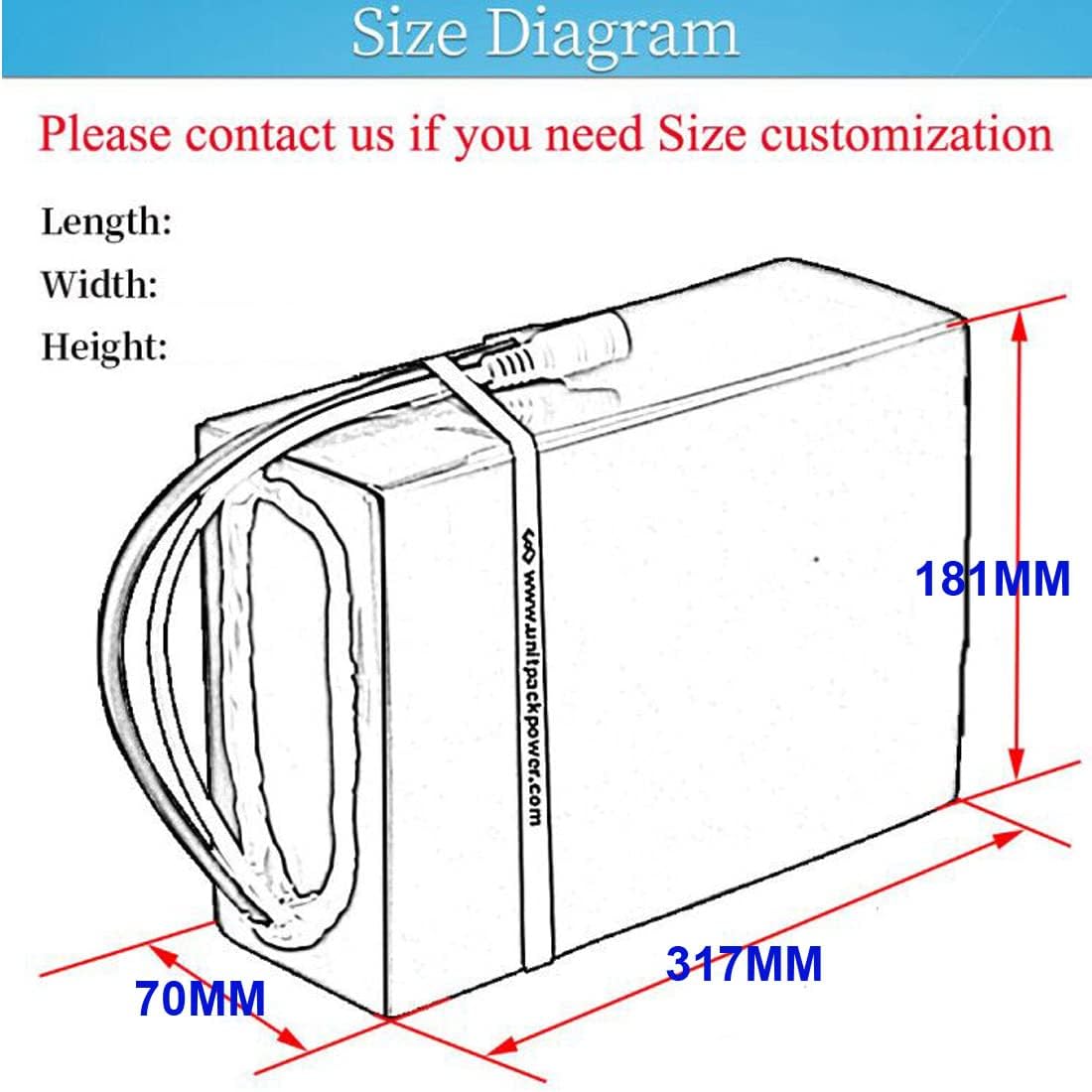 Note Size: 317*181*70MM//8.1KG; 【Li-ion Battery Parameter】60V 25AH, 2500mAH Cell, suitable for 750w 1000w 1500w 2000W motor. Max Constant Discharge Current: 50A, Charger: 67.2V 3A. Discharge port: A pair of XT60