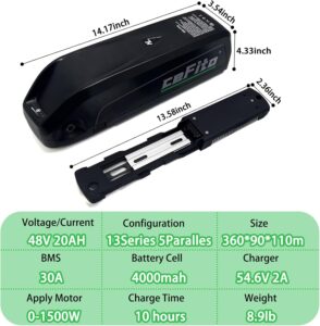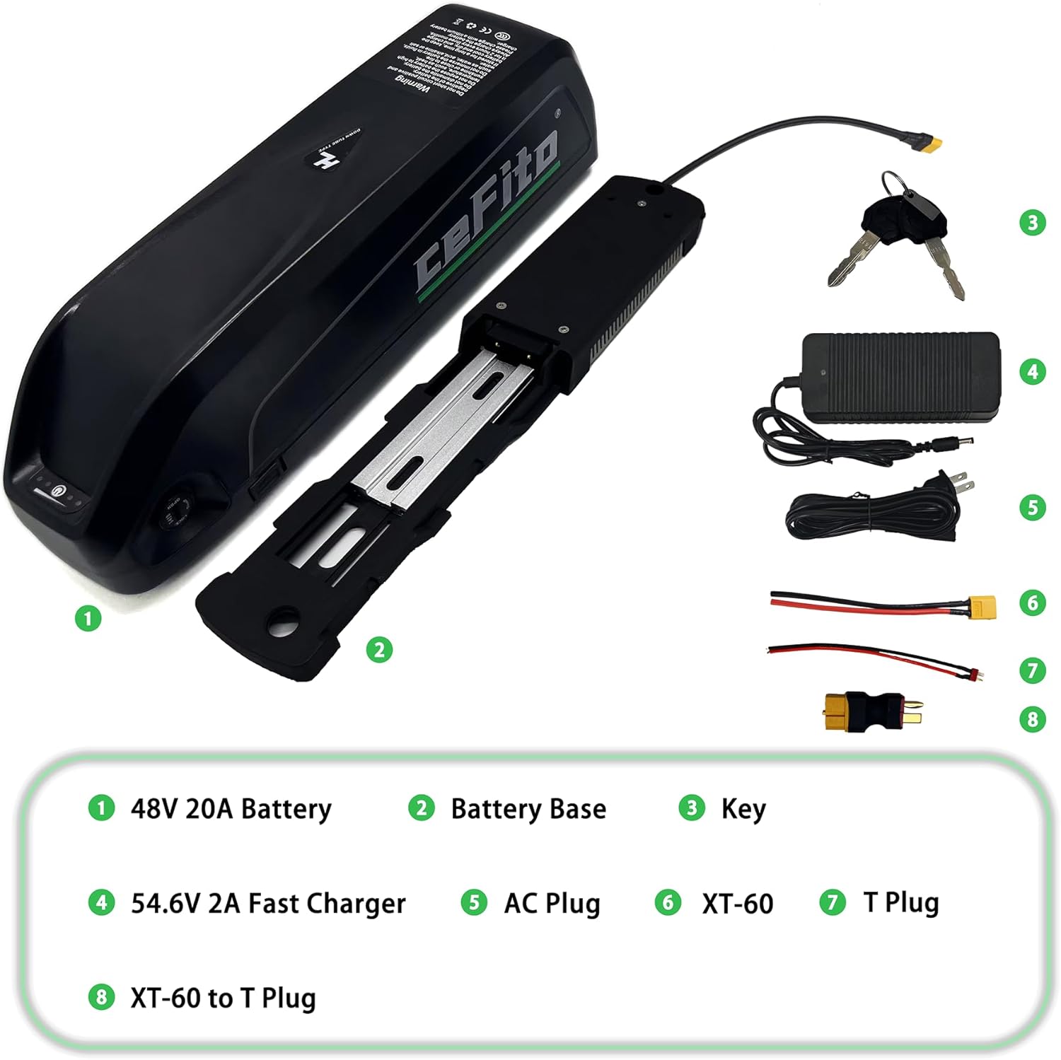 【Ebike Battery Parameter】 48V ebike battery size: 14.2*4.3*3.54inch. The 48v 20ah ebike battery is suitable for 0-1000w motor. The 48v e bike battery accessories have Battery Base、54.6V 2A Fast Charger、2 Keys、T plug、XT-60 to T Plug、Instruction Manual