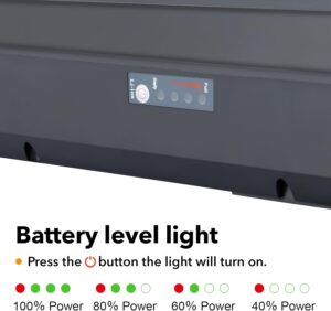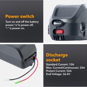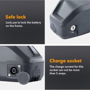 Convenient and Safe Lock Design: This electric bicycle battery has a built-in lock, which can effectively prevent the battery from being stolen. The lock is on the left side of the battery. The red power switch control the battery power.The battery has a standard 10A output port and a status indicator light. Press the power button long time to turn on the indicator light and 2seconds later,it will turn off directly