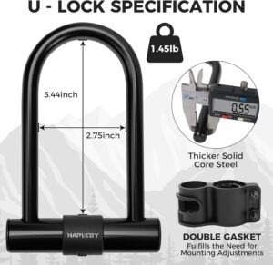 1. STURDY AND DURABLE: The HAPLEBY U-Lock is made of 0.55-inch solid steel and is resistant to cutting, prying and drilling. The surface is treated with electrophoresis to forever prevent rust, which greatly improves the service life and good using experience.