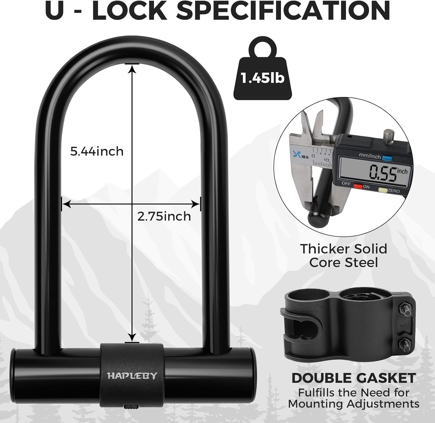 Hapleby Premium Bike Lock Set with 2 Keys, Bike U-Lock with 6 Feet Thickened Solid Steel Cable, Heavy Duty Anti Theft Bicycle U-Lock with Mounting Bracket for Road, Mountain, Folding Bike and Scooter