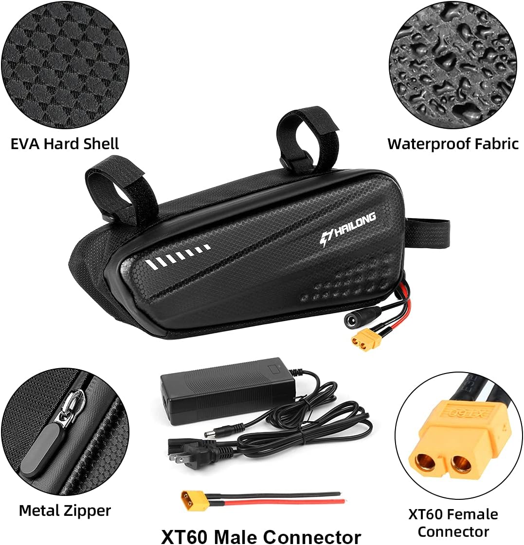 🔋Battery size is only 10*3.94*3.54 inch and the weight is 4.63lb. Lithium ion battery with small volume, light weight. Suitable for various E Bike , most mountain bikes and road bikes, with XT60 connector & 42V 2A Fast Charger. Fit for 250W 350W 500W WMotor.(Product includes waterproof bags and batteries)