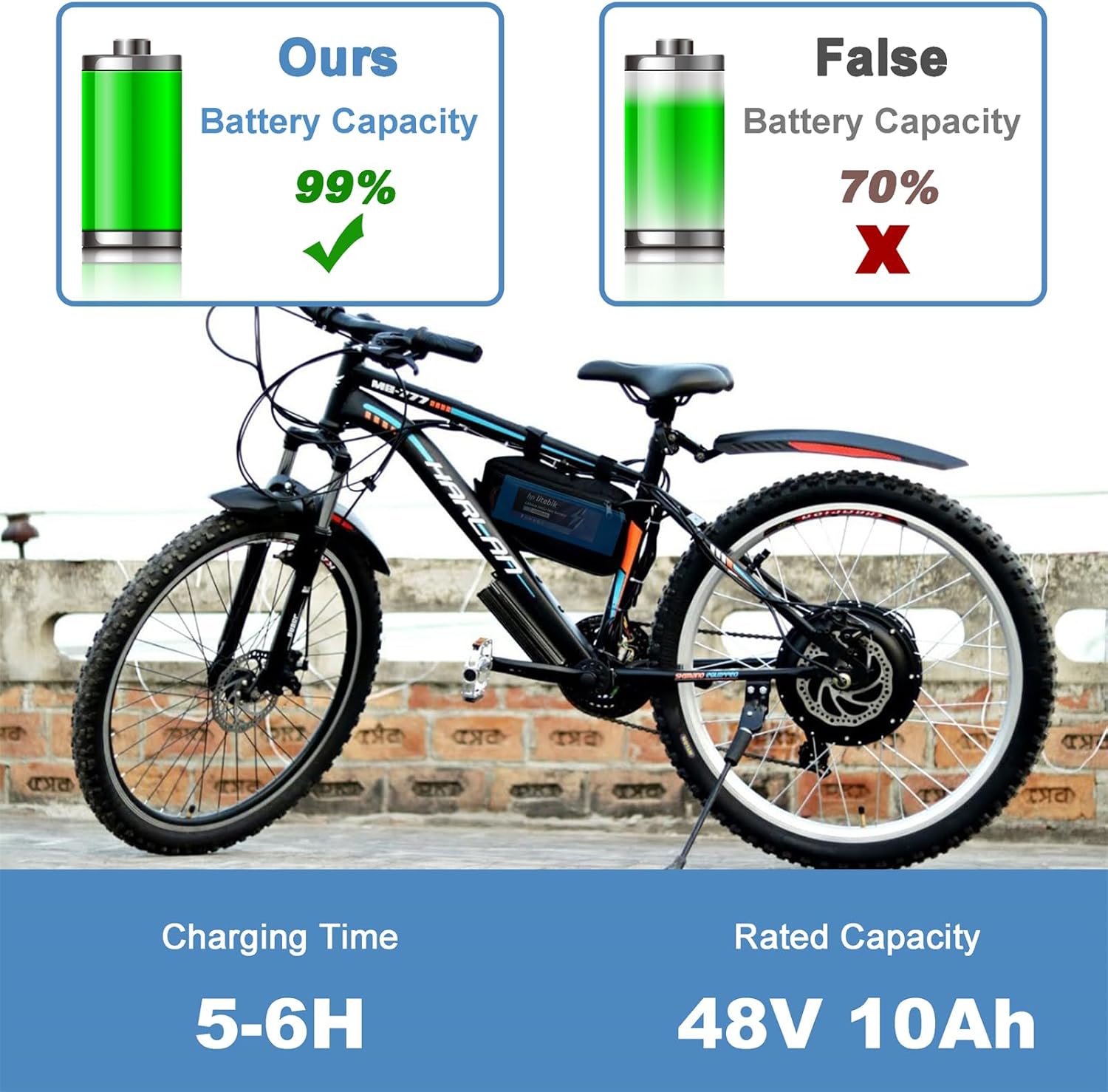 【A-Grade Cells & Superior Capacity】The HPLITEBIK 48V 10Ah lithium-ion battery features A-grade cells, delivering an actual capacity of up to 10.4Ah and a total capacity of 499.2Wh. Even after 1500 deep charge/discharge cycles, the battery retains over 80% of its capacity, ensuring long-lasting performance and reliability.